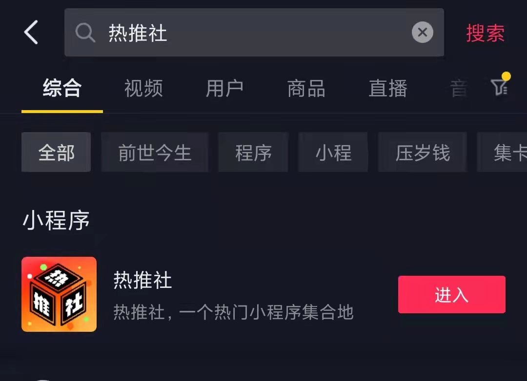正常的推广方式是,在你的抖音视频或主页中引导你的抖音粉丝或视频观众在抖音里搜索【热推社】进入小程序,如下图,输入你的口令,他们测试并看完广告后你就有收益了。